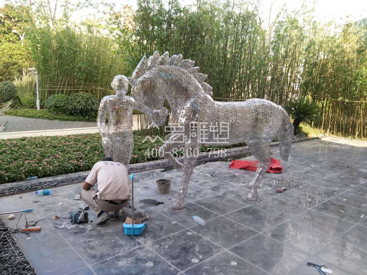 不銹鋼鏡面鏤空馬與人雕塑,由不同字體的家字組成,雕塑美觀現(xiàn)代感強。