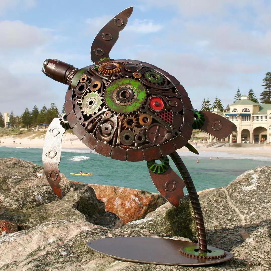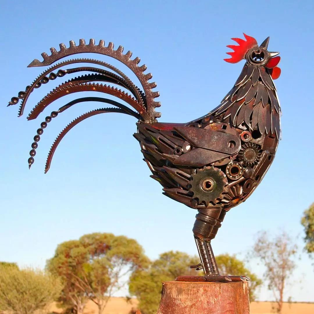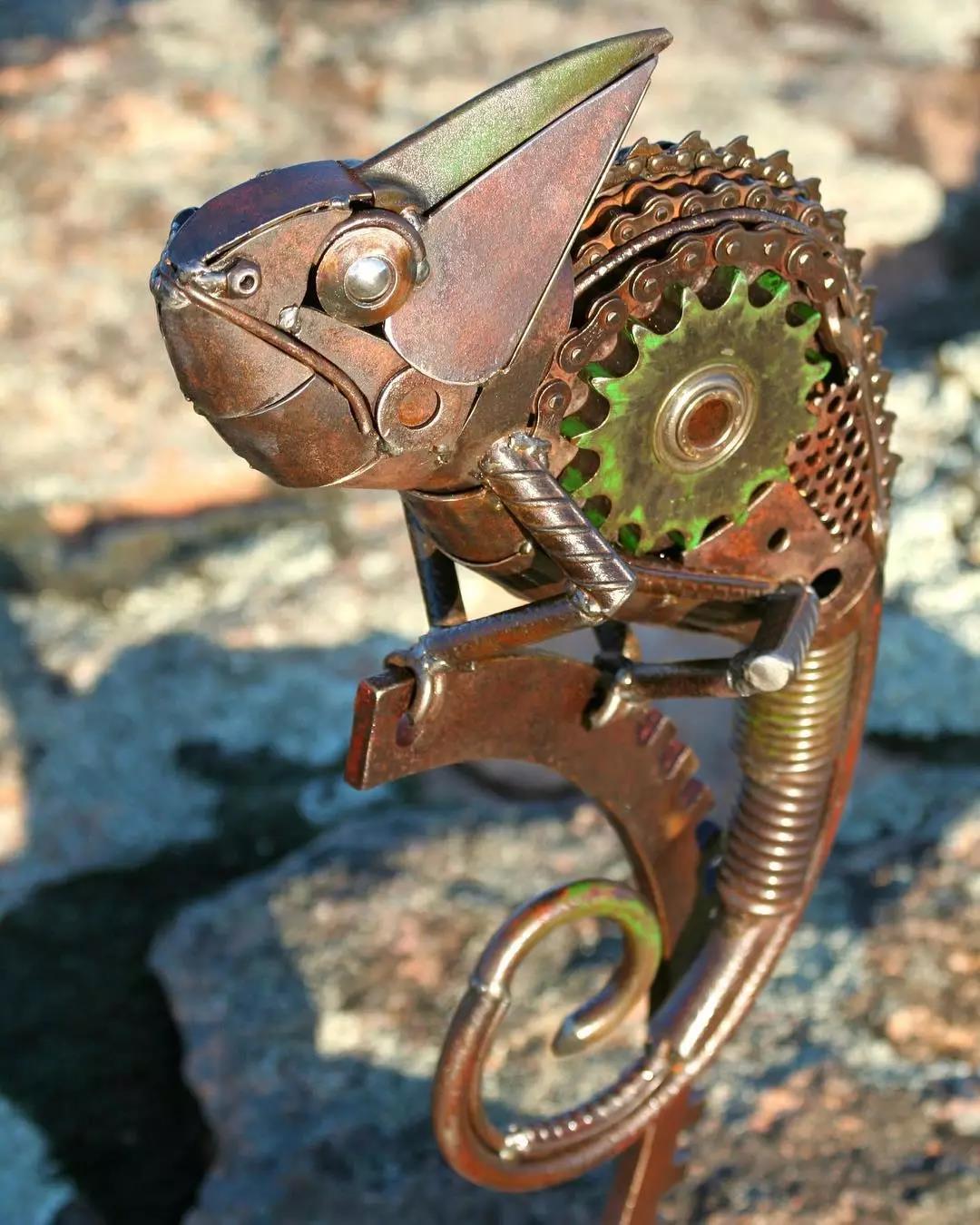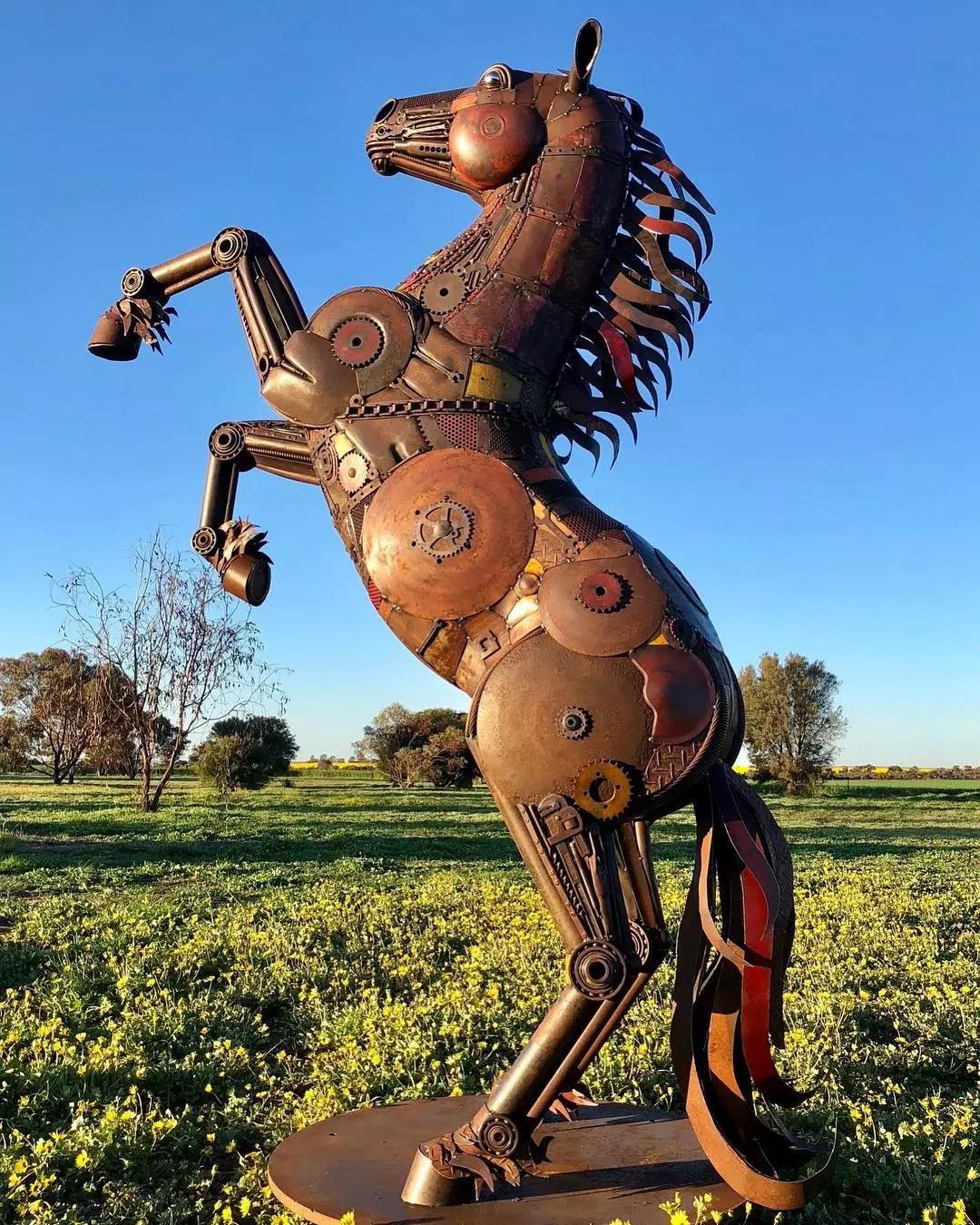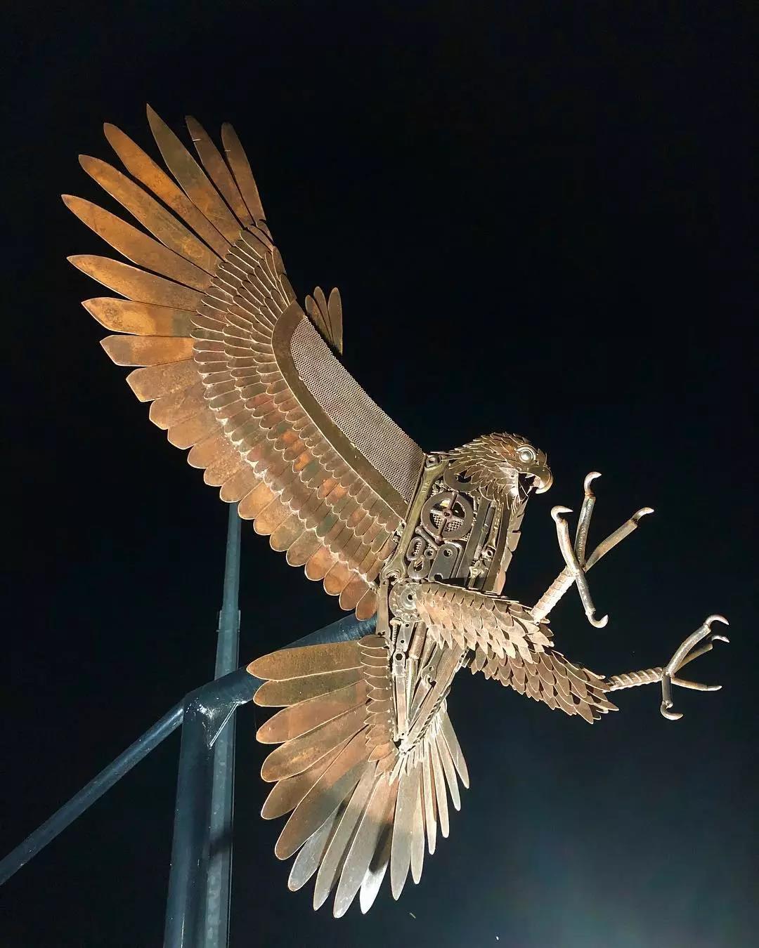 他在舊機器和廢金屬垃圾堆中扒出了可用的再生金屬,創作了這些雕塑作品。