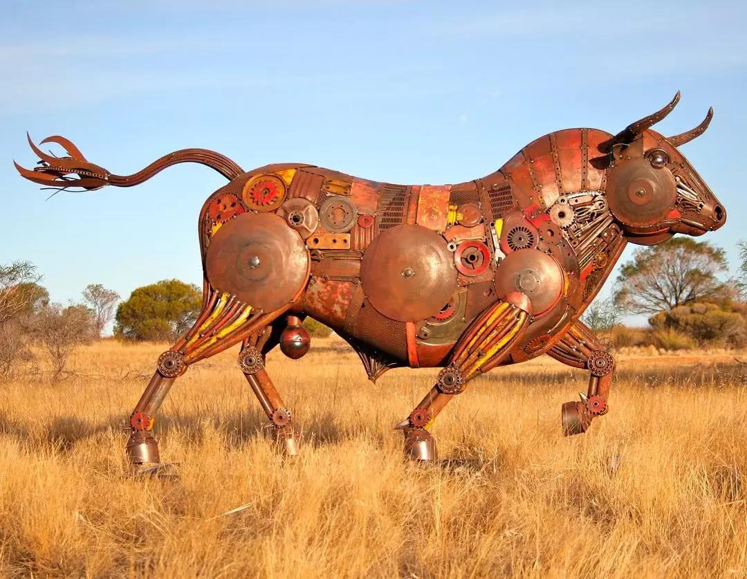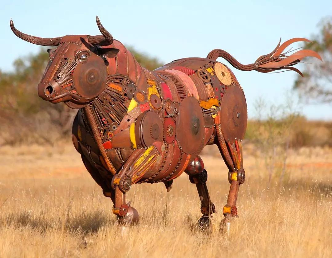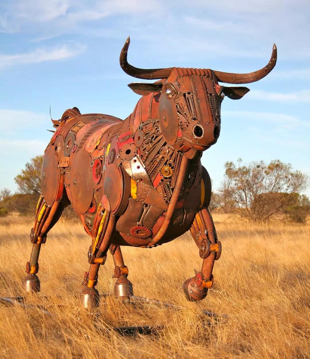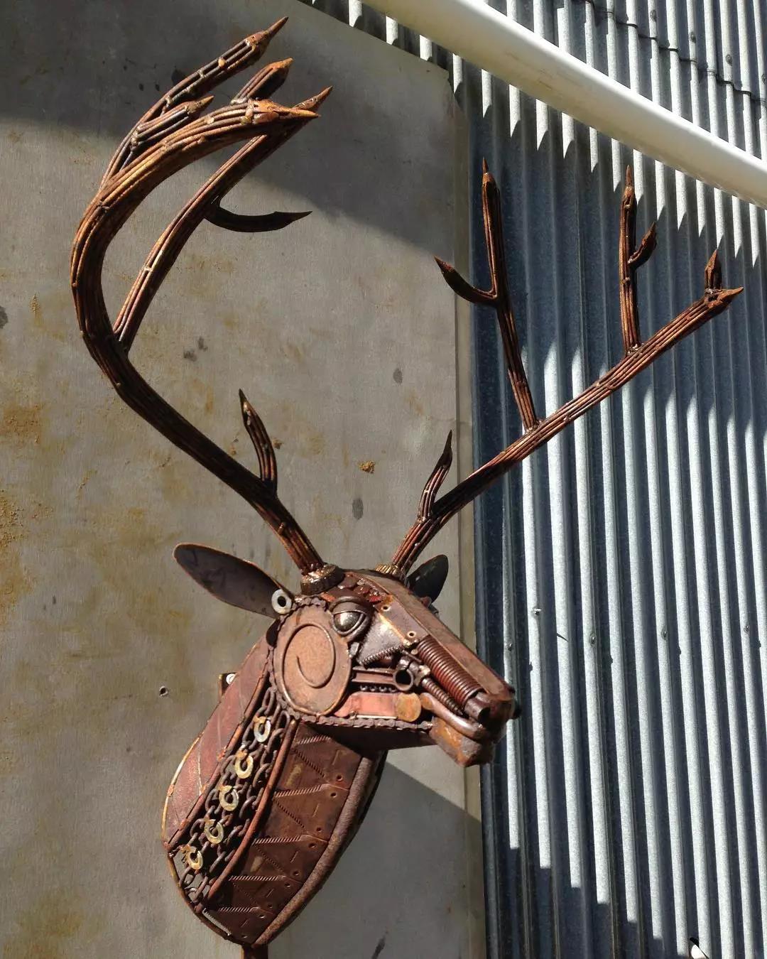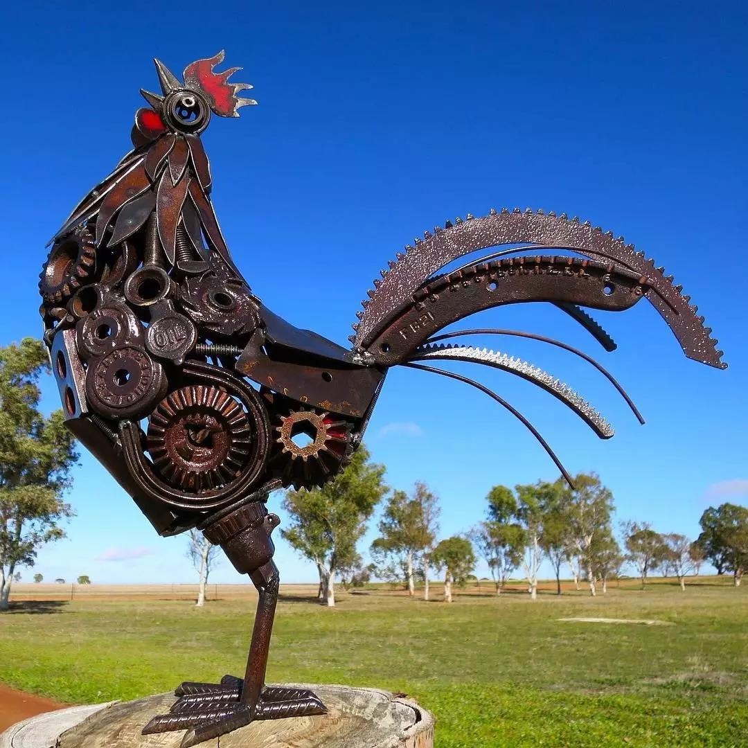 他在舊機器和廢金屬垃圾堆中扒出了可用的再生金屬,創作了這些雕塑作品。