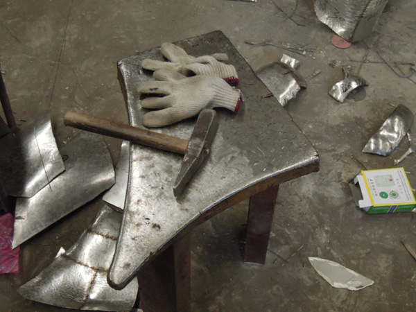 接下來就是要用最簡單最原始的工具,將分割好的每個小塊通過人工不斷敲打的方式,利用金屬的延展性形成與雕塑表面相匹配的立體表面。這個過程是最費體力的,同時也會產生出高強度的噪音,工人師傅們就是在這么嘈雜的工作環(huán)境中,制作著一件又一件精美的藝術品。