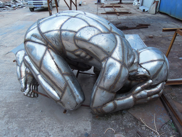 不銹鋼雕塑這種反復的敲打需要足夠的時間和耐心,只有當每塊都可以比較好地與雕塑作品的某個區(qū)域吻合起來的時候,這道工序才算完成.所有表面的小塊都敲打定形之后,每個小塊之間通過焊接的方式連接起來,就形成了最終雕塑的外表面,看起來跟原來的作品基本一致。由于冷作的方式是通過敲打的方式來塑造作品的外表面的,所以比較適合表面不是特別復雜的雕塑作品。