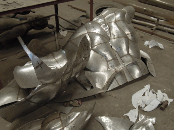用玻璃鋼制作的模型強度會比較好,不用擔心像泥塑的模型那樣容易碰壞。采用冷作加工的方式時,工人們會將整個雕塑的外表面分割成很多個小塊,并且會對每個塊進行編號。用于不銹鋼冷作加工的原材料是事先做好的不同厚度的不銹鋼板,工人們需要在不銹鋼板上根據編好號的每一個小區(qū)域,畫出與之對應的形狀。由于不銹鋼板是平面的,而雕塑作品的表面是立體的,所以一是每個小塊的面積不能太大,另外每個小塊也需要留有一定的余地來方便之后的加工。